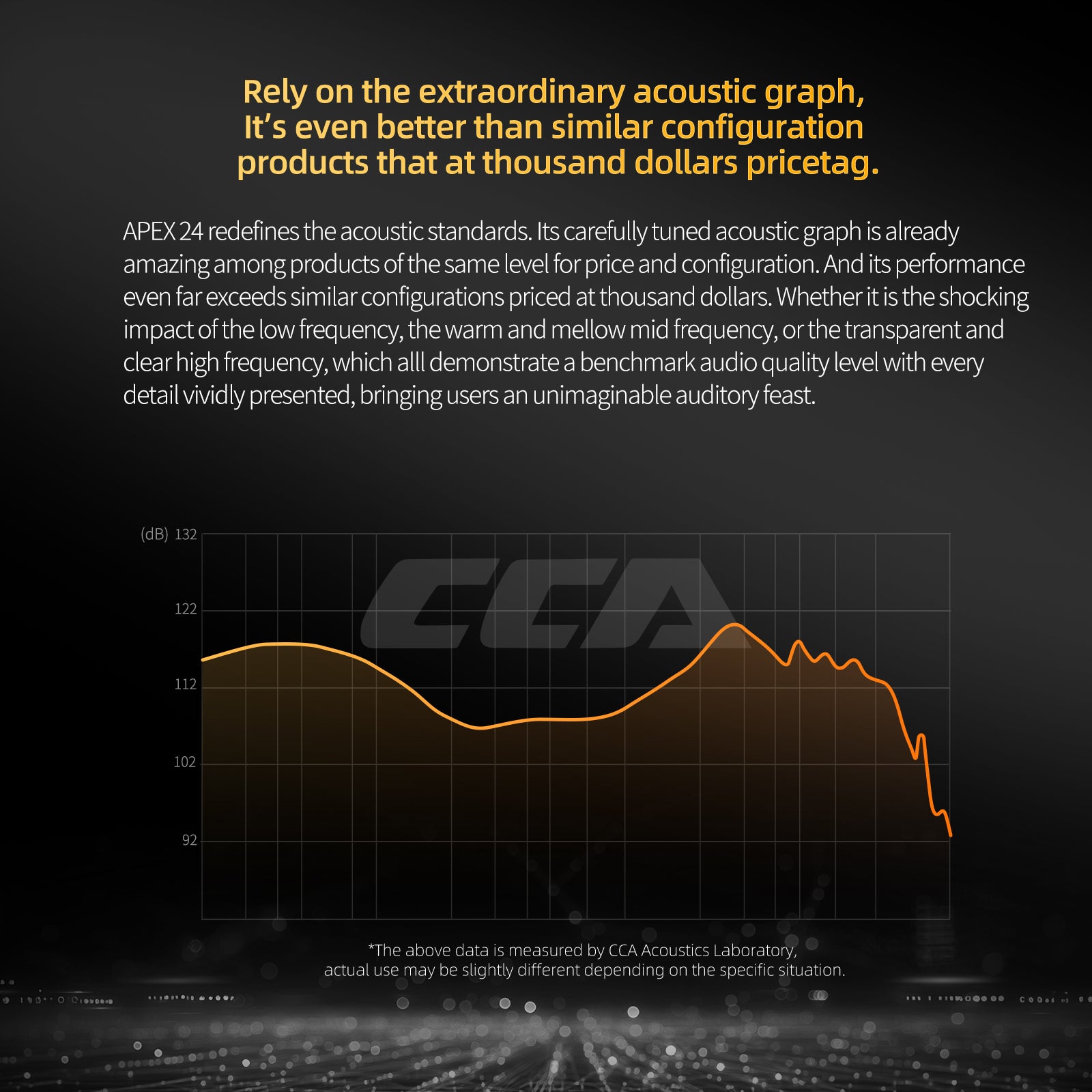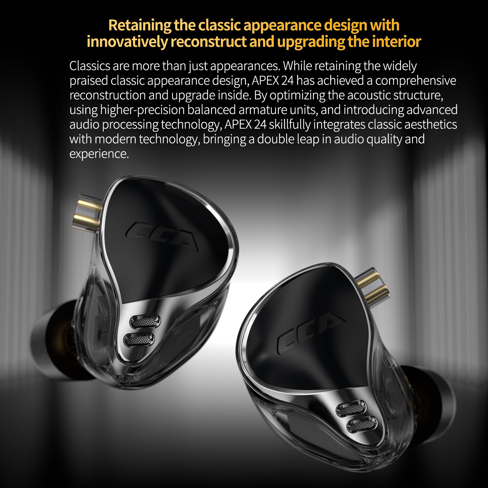 プロフェッショナル ユーザー向けに設計された APEX24 は、高度な電子クロスオーバーを備えた24 ユニットのハイエンド バランスド アーマチュア構成を特徴としており、正確な周波数制御と卓越した明瞭度を実現します。